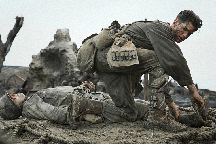 电影的下半部分几乎都发生在战场上。道斯所在部队的任务是夺取战略高地,这是位于冲绳悬崖边上的一块重要高低,被那些毫无人道的日本人所占领。《血战钢锯岭》中延伸的战斗场景与《拯救大兵瑞恩》相似,充满了典型的吉布森风格。道斯发现当自己被困在悬崖上的时候,只有自己的信念能支持保护着自己。因此,在叙述的转变中,我不禁发现那些难以置信的感动。道斯开始在可能是他人生中最后几个小时内,尽可能地将悬崖上许多命悬一线的战友从战场上救回,并进行治疗。