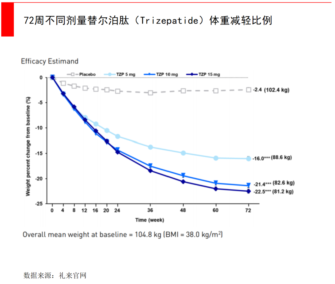 根据一项针对替尔泊肽的临床研究发现,不同剂量(5mg、10mg、15mg)的替尔泊肽均可显著、持续地减轻肥胖患者体重,最高剂量组72周平均减重48斤。该研究于2022年6月4日,由耶鲁大学医学院的研究人员发表在《新英格兰医学杂志》上。
