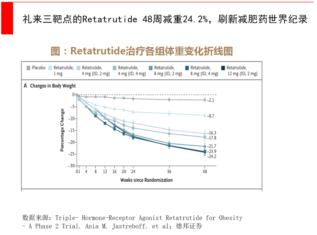 在未来,以GLP-1为中心,还会有各种各样的变种出现。比如同样是GLP-1,可能某家是改动了第8位氨基酸,还是第26位的、第34位的,是置换氨基酸,还是加了某条蛋白链,不同组合出来的效果是不一样的。以及礼来还在研究更新的三靶点,已经有不错的临床数据,Retatrutide(雷塔鲁肽,或译为瑞他鲁肽),三个靶点是GLP-1/GIP/Glucagon。