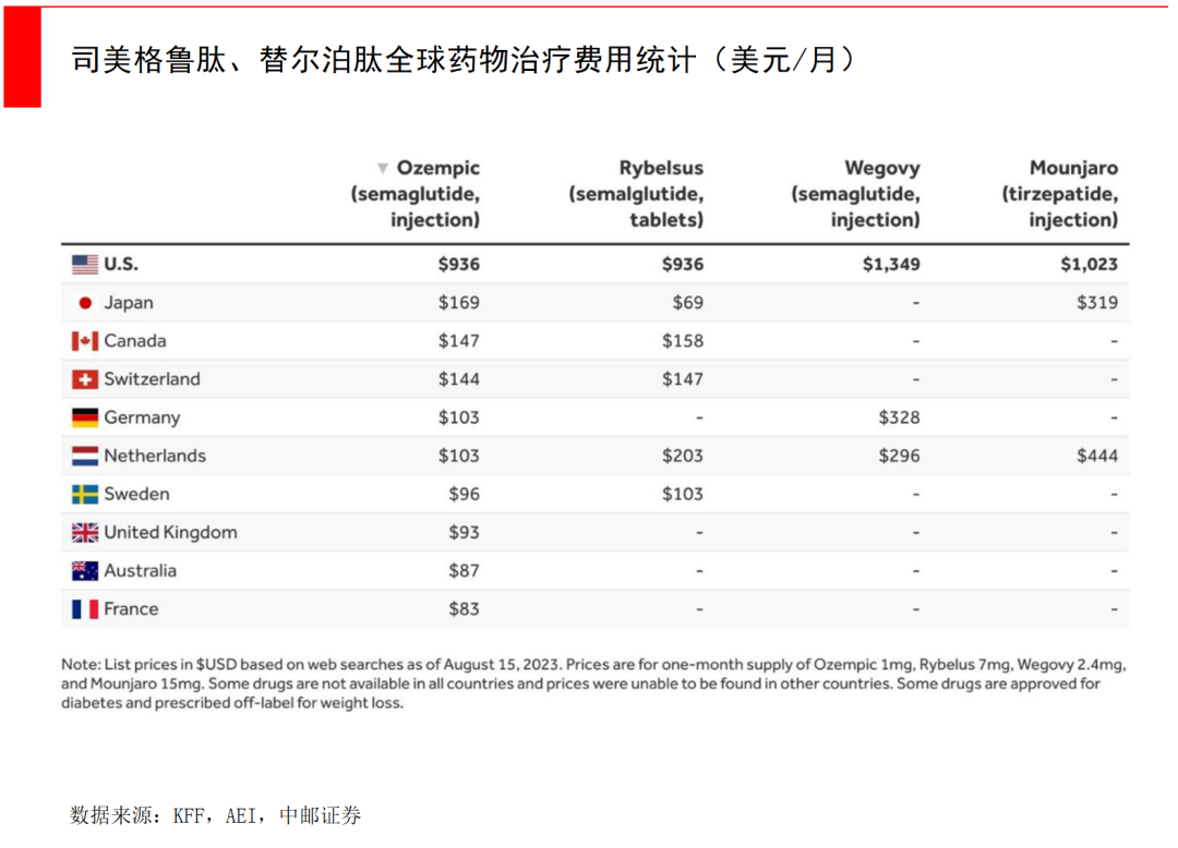 例如,根据KFF针对司美格鲁肽和替尔泊肽,每月按疗程注射并维持的治疗费用测算,司美格鲁肽(降糖药Ozempic)与口服司美格鲁肽(Rybelsus)标价均为936美元/月,司美格鲁肽(减肥药Wegovy)标价为1349美元/月,替尔泊肽(Mounjaro)标价为1023美元/月,两种药品(4个剂型)在美标价显著高于其他国家,价格差异约5~10倍。