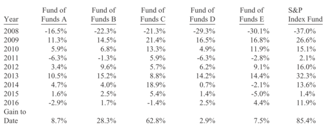 信中图表显示,自2008年至2016年底,标普500指数基金的年化回报率为7.1%,而Protege Partners挑选的基金年化回报率只有2.2%。