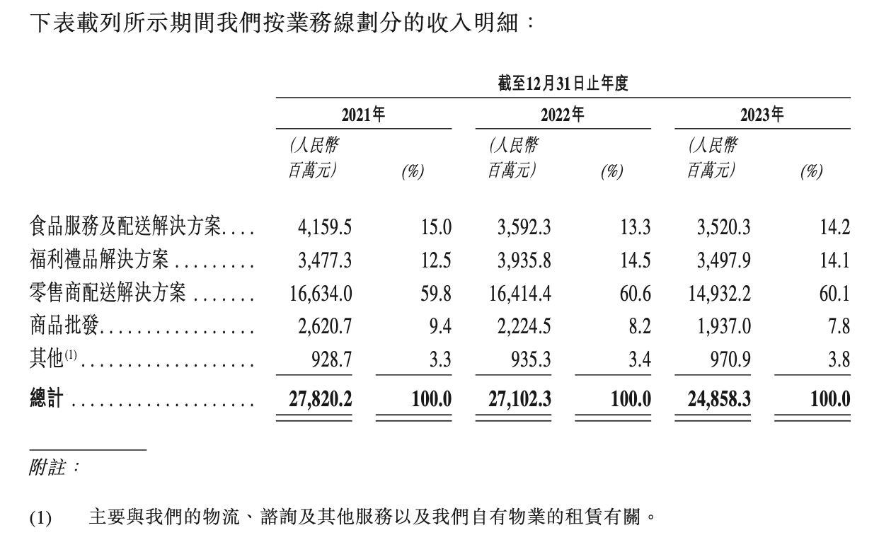 招股书显示,麦德龙供应链是中国食品快消供应链解决方案服务商,服务对象和方向主要包括三块,分别是:对于企业及机构客户提供福利礼品解决方案、食品服务及配送解决方案;对于零售商,提供零售商配送解决方案(包括向零售商的产品销售及供应链服务);商品批发。