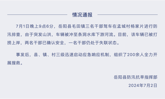 “微巴陵”消息,7月1日晚上9点6分,岳阳县毛田镇三名干部驾车在孟城村杨家片进行防汛排查,由于突发山洪,车辆被冲至条洞水库下游河流。目前,该车辆已被打捞上岸,两名干部已确认安全,一名干部仍处于失联状态。事发后,县、镇、村三级迅速启动应急响应机制,组织了200余人全力开展搜救。