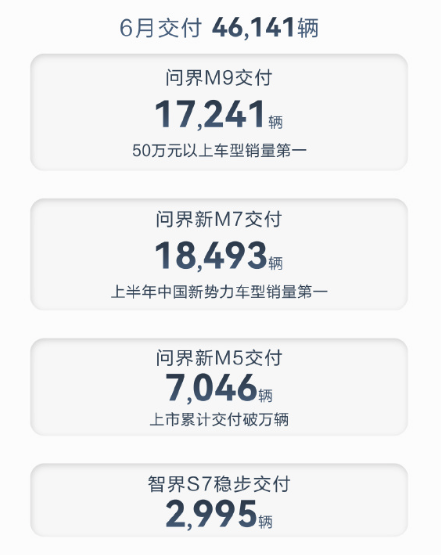 7月1日晚,鸿蒙智行宣布,全系今年上半年累计交付194,207辆,6月共交付46,141辆。
