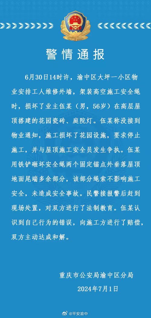 近日,重庆一小区工人在高空作业时安全绳被业主砍断的视频引起热议。重庆市公安局渝中区分局7月1日通报,6月30日14时许,渝中区大坪一小区物业安排工人维修外墙,架装高空施工安全绳时,损坏了业主伍某(男,56岁)在高层屋顶搭建的花园瓷砖、庭院灯。伍某称没接到物业通知,施工损坏了花园设施,要求停止施工,并与屋顶施工安全员发生争执。伍某用铁铲砸坏安全绳两个固定锚点外垂落屋顶地面尾端多余部分,该部分绳索不影响施工安全,未造成安全事故。民警接报警后赶到现场处置,对双方进行了法制教育。伍某认识到自己行为的错误,向施工方进行了赔偿,双方主动达成和解。