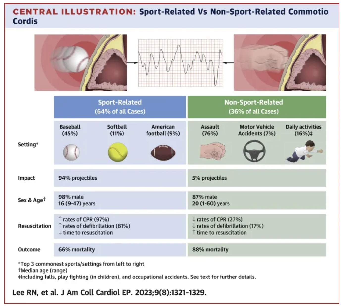 其二,心脏骤停即便是完善的急救,也不是必然100%成功。及时用准确的急救措施,如CPR,AED除颤,可以挽救不少生命,但心脏骤停本身的危险性与紧急性就决定了不会有100%的把握。前文提到的橄榄球运动员Damar Hamlin现已重回赛场,但根据一篇关于心震荡的综述,体育运动中出现的病例,尽管97%接受CPR,81%有除颤,死亡率仍高达66%。尽管这比非体育运动中出现的心震荡88%死亡率(CPR与除颤比例仅分别为27%与17%)有改善,但还是很高的死亡率。