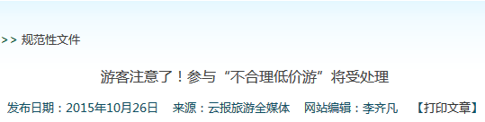 发布了《云南省整治“不合理低价游”专项行动方案》,成立监理中心,建立旅游购物退货的“快处快赔”机制,整治“不合理低价游”。