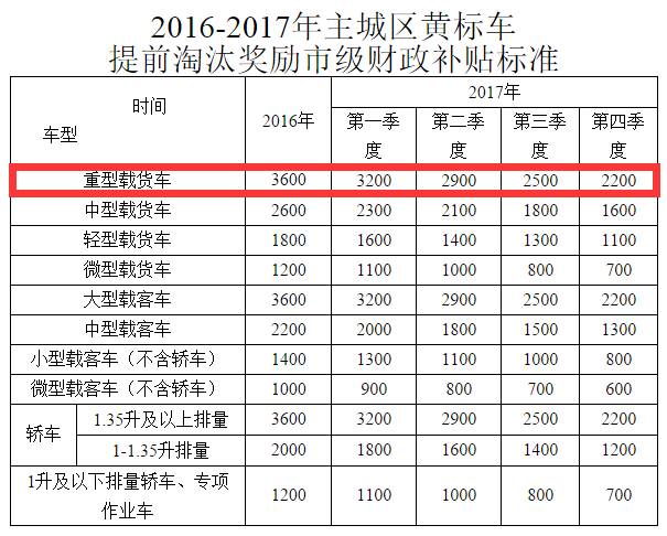 该《细则》明确自2017年第一季度起,每季度各车型黄标车提前淘汰市级财政补贴标准按2016年市级财政补贴标准的10%递减。以补贴标准最高的重型载货车为例,到2017年第四季度,该项标准将由原来的3600元/辆下调至2200元/辆。