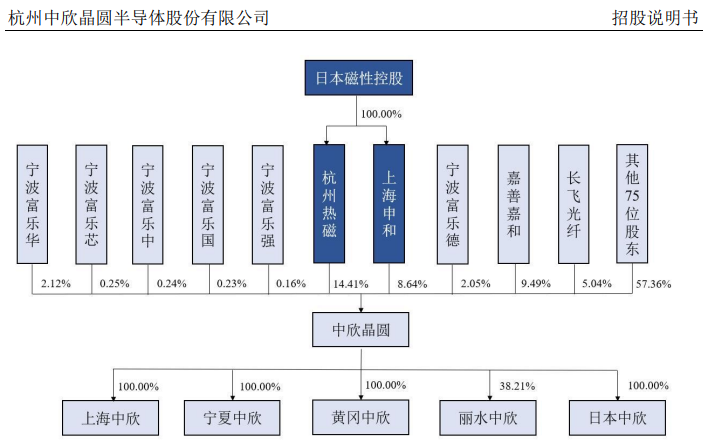 招股书显示,中欣晶圆本次发行上市系日本上市公司Ferrotec(日本磁性技术控股股份有限公司,“日本磁性”)分拆其半导体硅片部分资产及业务上市。截至2022年8月,Ferrotec的全资子公司杭州热磁与上海申和合计控制中欣晶圆28.11%的表决权,为公司控股股东。