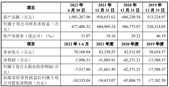 2019年至2021年及2022年上半年,该公司实现营收分别为3.87亿元、4.25亿元、8.23亿元和7.02亿元,同期分别亏损1.76亿元、4.24亿元、3.17亿元、7517.88万元。