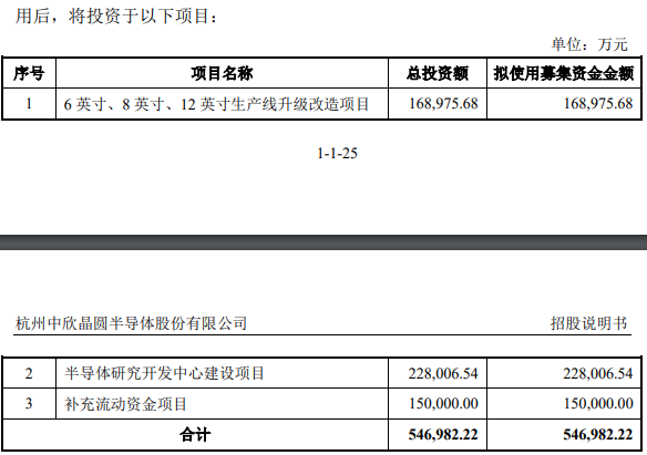 该公司此次IPO募资拟投资于6英寸、8英寸、12英寸生产线升级改造项目(16.9亿元),半导体研究开发中心建设项目(22.8亿元),以及补充流动资金项目(15亿元)。