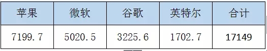 为了对付共同的敌人-标准必要专利大户和NPE等专利权人,在天然的商业利益驱使下,即使是存在竞争关系并发生过龃龉(详情见下文)的苹果、微软和谷歌等公司也化敌为友、共仇敌忾地结成了事实上的专利恶霸联合体,另外,英特尔(INTEL)公司也是专利恶霸联合体的重要成员。上述公司市值情况见下表:
