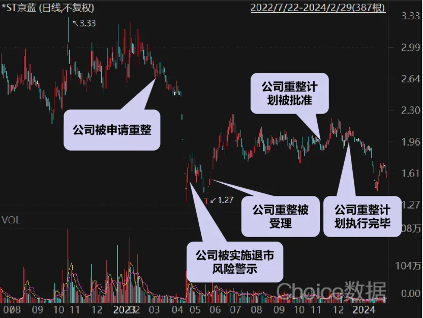 2023年6月1日*ST京蓝股价最低还在1.41元,该公司同年6月5日破产重整被法院受理,7月11日该公司股价已最高涨至2.26元/股,短短数个交易日股价涨幅超60%。此后该股也是轮番被爆炒,股价震荡向前。投资者也是进进出出。2023年3月其股东户数一度高达近5.8万户,随后一路走低,截至今年3月末股东户数还达约3万户。