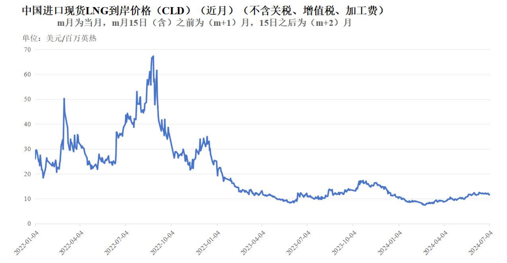 上海石油天然气交易中心数据显示,中国LNG出厂价格从2022年时的最高超8500元/吨降至目前的4500元/吨,降幅约为47%;中国进口现货LNG到岸价格从2022年时的最高近70美元/百万英热降至了目前的11美元/百万英热左右,降幅约为83%。
