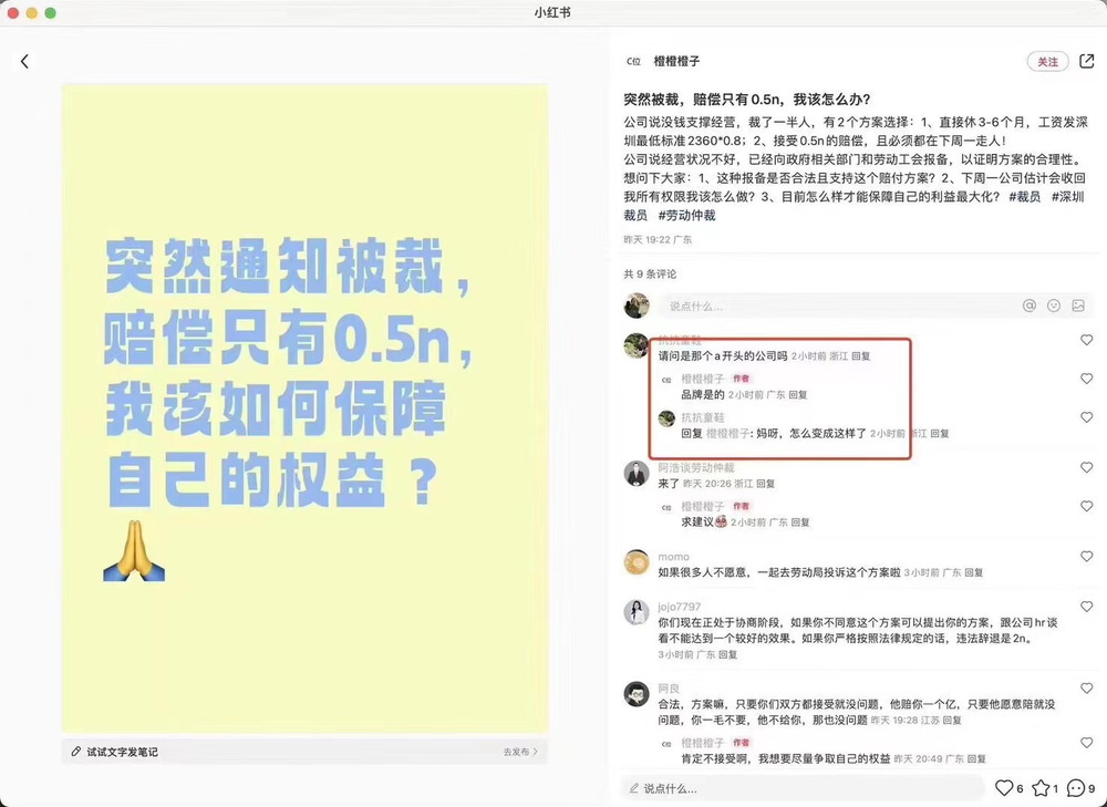 该帖文提到,公司将裁掉一半员工,并为员工提供两种方案,一是员工休假3至6个月,期间月薪为深圳最低工资标准2360元的80%,即1888元;二是接受0.5N(即0.5*员工在公司工作年限*月薪)的赔偿金,在下周一(7月8日)前离职。5日上午,该内容已无法在社交平台上检索到。