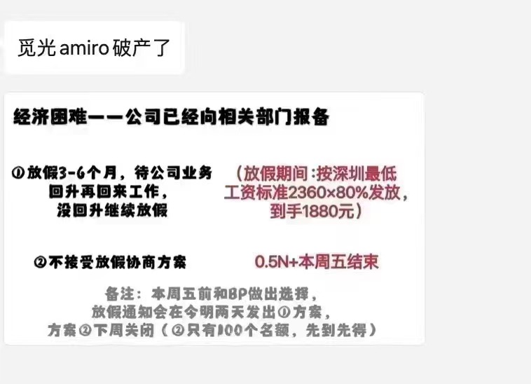 7月4日晚,疑似家用美容仪品牌AMIRO觅光员工在社交平台上发帖称,公司因经营状况不佳正进行大范围裁员。