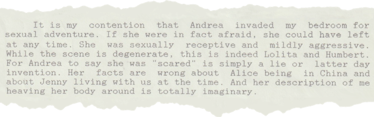 安德丽娜回忆,1976年,继父爬上了她的睡床,并对她进行了性侵犯,“他想要让我握住他的生殖器,我的手变得麻痹,我很努力假装我在睡觉。”事后,她没有告诉母亲这件事,因为继父威胁她,如果母亲知道了就杀了她。回到父亲家后,她曾通过继母将此事转告父亲,但吉姆·门罗不仅没有与母亲对峙,反而让她的两个姐姐在母亲面前保持沉默,并交代她们尽量避免让安德丽娜与继父单独相处。这一防范成效甚微,性侵犯持续了数年,安德丽娜回忆,继父会在车上向她暴露生殖器并手淫。