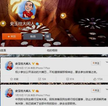 剧情来了!就在1月15日晚间,史玉柱在微博中表示:“中民投与民生银行没有关系。因我准备回民生银行担任董事,防止大家误解两者有关联,我已卖掉了全部中民投股份,辞去全部职务。”