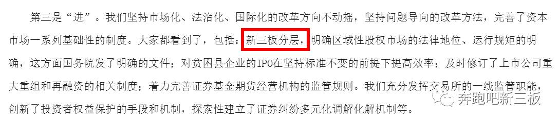 发布会伊始,刘士余主席将证监会一年来的工作概括为“稳、严、进”。其中,特意将“新三板分层”作为“进”这个关键词的注解内容之一,包含在完善资本市场一系列基础性制度建设之中。