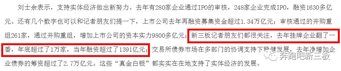 在证明“中国资本市场对支持实体经济做出新努力”时,又突出强调新三板2016年挂牌企业翻一番,挂牌家数超过1万家,当年融资超过1391亿元,接近248家企业IPO融资的1630多亿元。