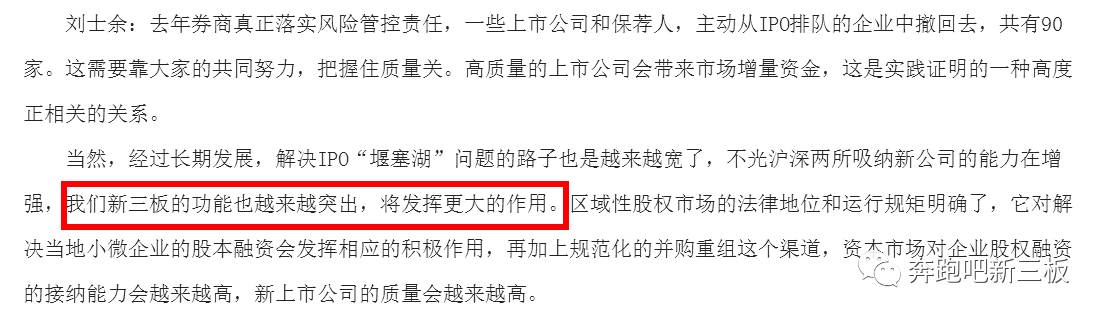 更为重磅的是,刘士余在谈及解决IPO堰塞湖的路子越来越宽时,提出:“除了沪深两所吸纳新公司的能力在增强,新三板的功能也越来越突出,将发挥更大的作用。”