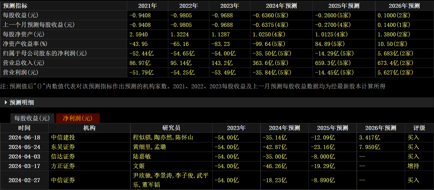 5家机构对北汽蓝谷的业绩做出预测,平均值认为公司2024年将亏损35.5亿元,2025年将亏损14.29亿元。其中两家对公司2026年的盈利情况做出预测,中信证券认为公司2026年归母净利润将达3.42亿元,而东吴证券则预测归母净利润为7.95亿元。