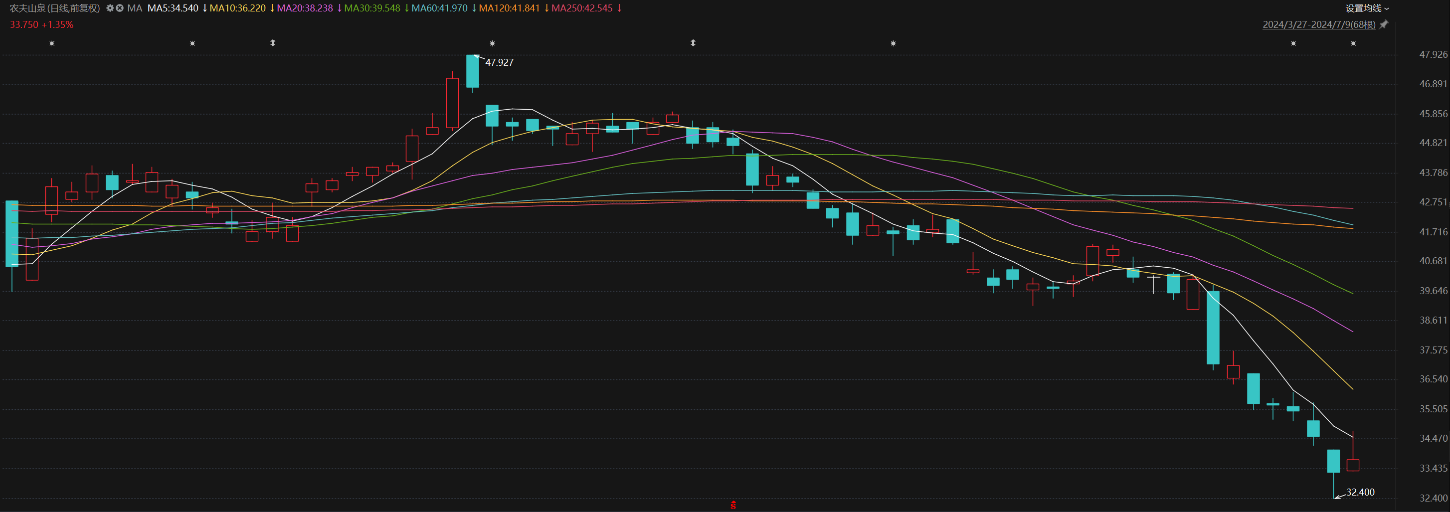 农夫山泉股价近期大幅下挫,截至7月9日收盘,公司股价涨1.35%,报33.75港元/股,公司总市值3796亿港元。较5月3日股价高点47.924港元/股下跌29.58%,市值蒸发近1600亿港元(约合人民币1485亿元)。本次增持按照7月9日收盘市值计算,预计将增持0.52%公司股份。