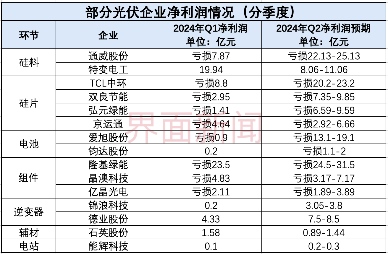 这两家企业二季度环比亏损额均大幅上升,尤其是通威股份,二季度亏损超22亿元,几乎是一季度的三倍。通威股份在去年上半年还是行业盈利王,赚了132.7亿元,与今年上半年亏损30亿-33亿元形成极大反差。