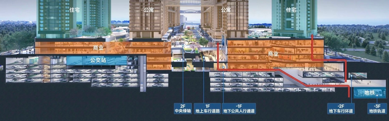 通过立体化交通系统,可以实现不同交通系统分层互联,人行系统、城市公共道路系统、地下轨交系统快速接驳,最大程度实现人车分流,科学化疏解交通压力,更加省时省心。