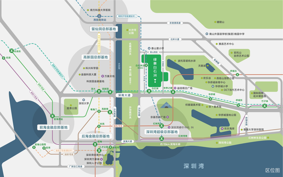 在《深圳市南山区国土空间分区规划(2021-2035年)》(审批中)中提出,南山区要建设深圳唯一的“中央公园”,以深圳湾CBD+中央公园构筑深圳核芯引擎,集聚全球总部企业、高端居住圈层和高阶完善配套,位置就在绿景白石洲旁。