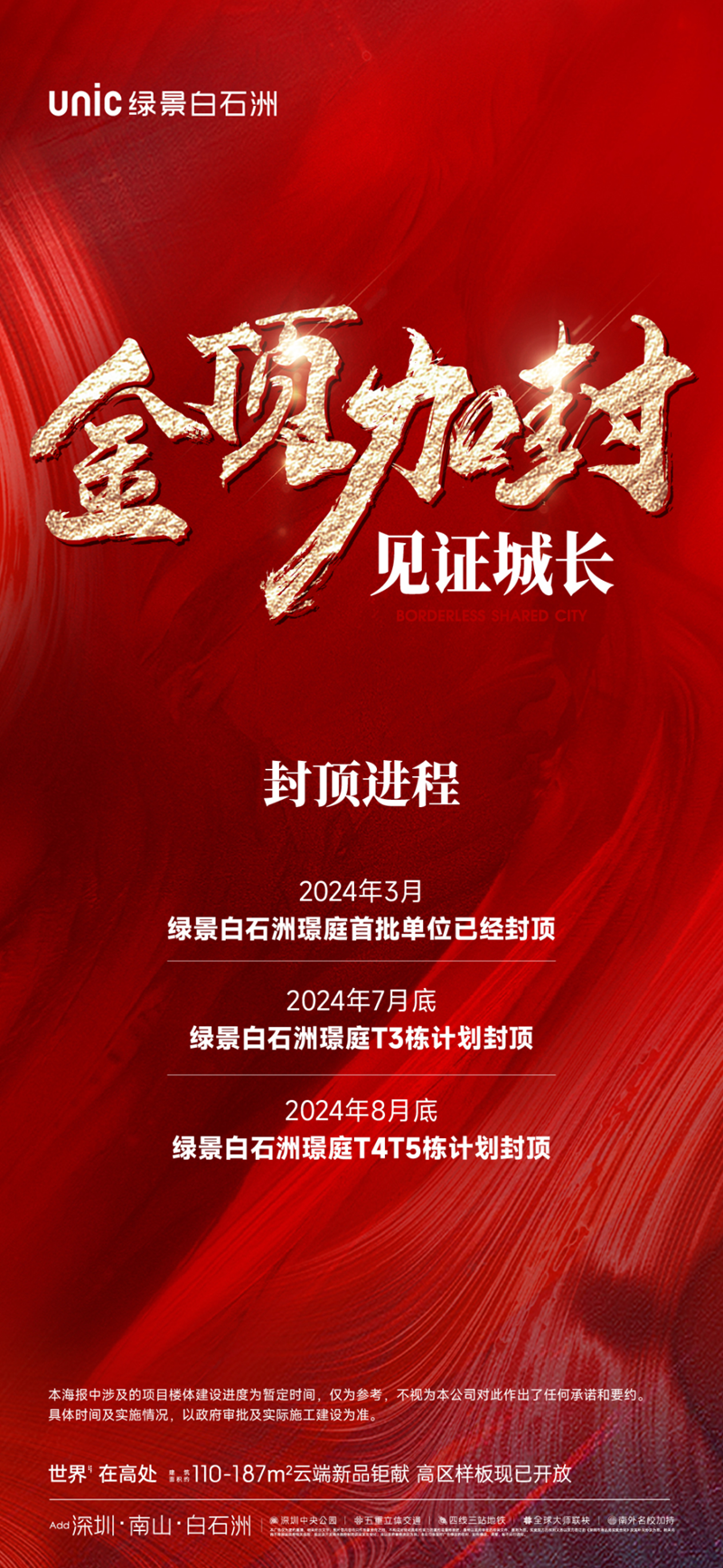 3月,经过日夜以赴的匠心雕琢,绿景白石洲首批单位已经封顶 ;