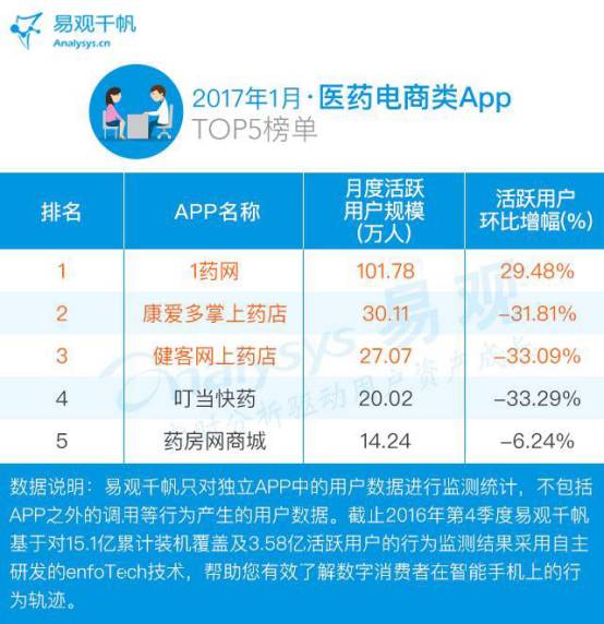 正品联盟的品牌效应也已经显现。2月23日,基于2017年1月移动应用大数据,易观公布了电商AppTOP100以及各领域细分榜单,其中1药网以101.78万月活人数稳居医药电商类榜单首位。