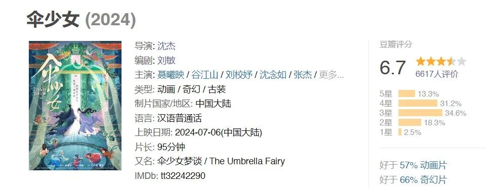 可惜的是,《伞少女》依然延续了国产2D动画电影画面精美、叙事糟糕的特点,豆瓣开分6.7,以及猫眼专业版预测2500万的票房数据,就已经说明了市场对这部电影的态度。