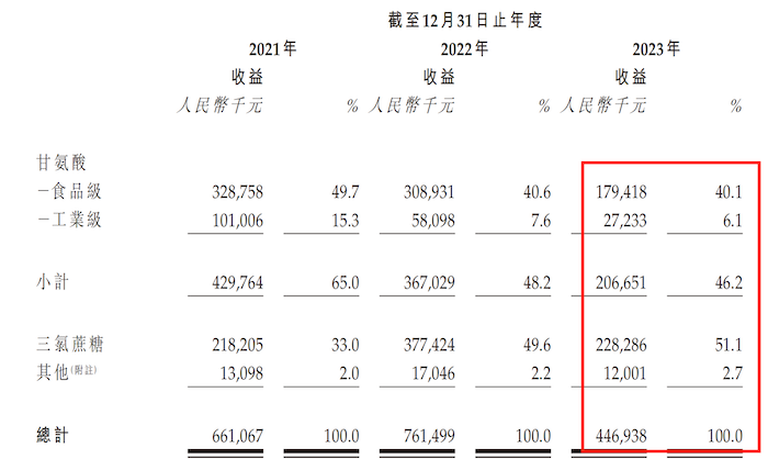 报告期(2021年至2023年)新琪安的收入较不稳定,分别为6.61亿元、7.61亿元和4.47亿元,其中2023年收入大幅下滑超40%。具体来看,公司甘氨酸收入同比下滑43.70%;三氯蔗糖收入同比下滑39.51%。