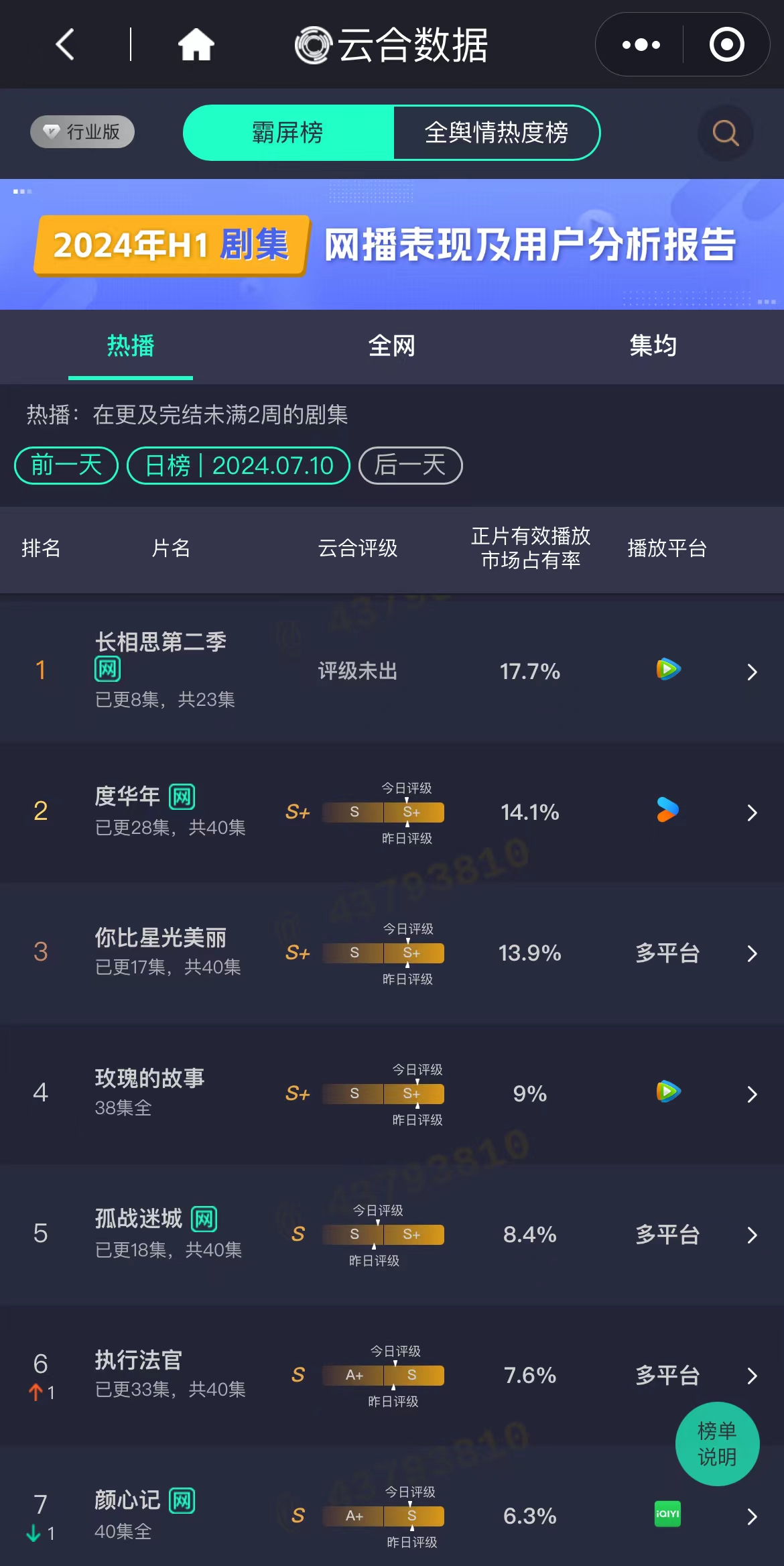 从云合数据的市占率看,该剧仍然是热播榜首位,但并未与第二名的《度华年》拉开差距,目前还没有出现去年第一季断层式领先的胜景。