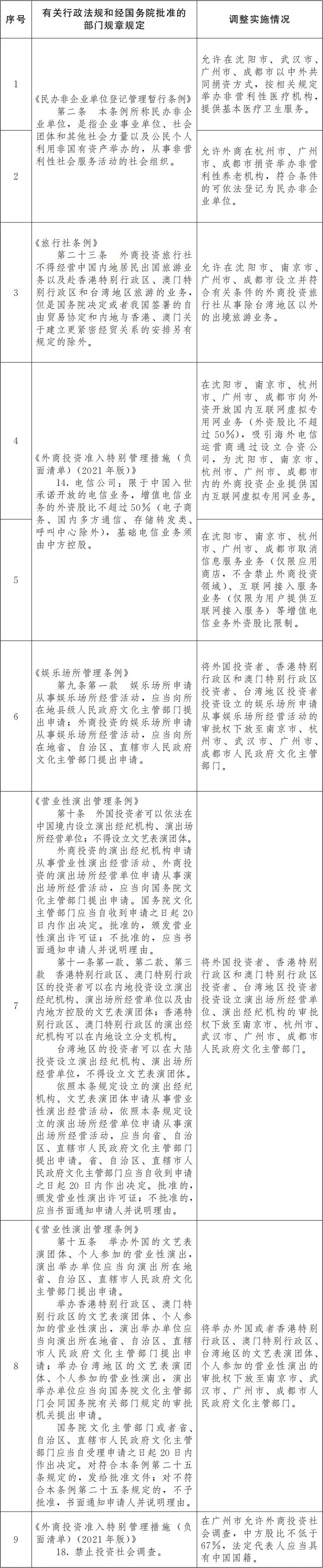 批复称,自即日起,在沈阳市、南京市、杭州市、武汉市、广州市、成都市等6个服务业扩大开放综合试点城市暂时调整实施《民办非企业单位登记管理暂行条例》、《旅行社条例》、《娱乐场所管理条例》、《营业性演出管理条例》、《外商投资准入特别管理措施(负面清单)(2021年版)》的有关规定。