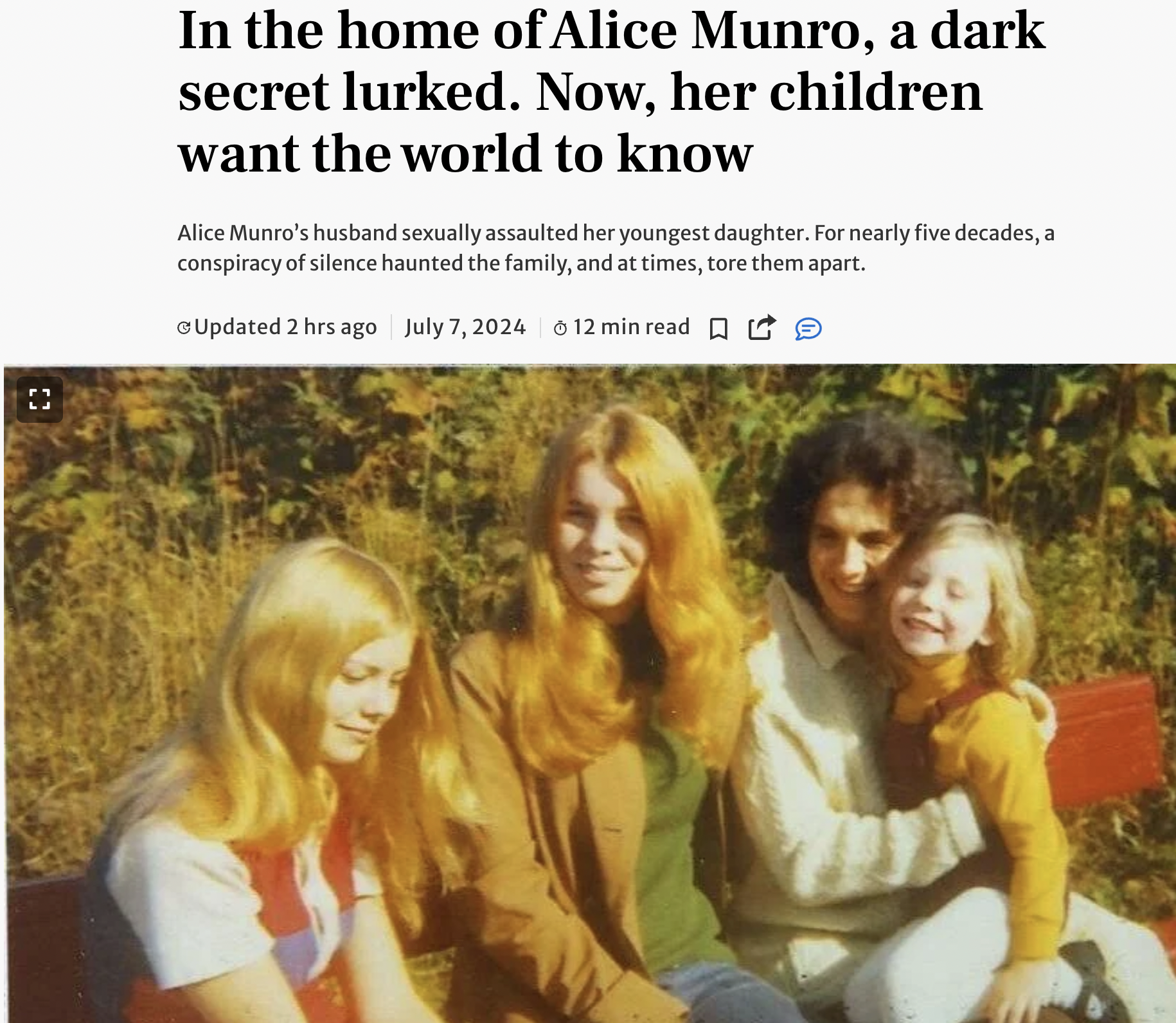 当地时间7月7日,门罗的小女儿安德丽娜·斯金纳(Andrea Skinner)在《多伦多星报》(Toronto Star)发表文章,披露自己从9岁起遭遇继父盖瑞·弗兰姆林(Gerry Fremlin)的性侵犯。斯金纳在25岁时通过一封信向母亲坦白了真相,但门罗故意忽视小女儿的遭遇,选择继续与自己的第二任丈夫盖瑞生活在一起,直到他2013年去世。