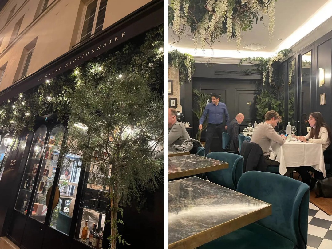 上次去巴黎是冬天,坐了十几个小时的飞机,降落戴高乐机场已经是晚上六点。因为平时喜欢住的左岸六区七区节日里溢价太高,我就随便订了个拉丁区的酒店,叫基督山伯爵,booking.com上九分高评。入住已是晚上八点多,我问有没有什么推荐吃饭的地方。前台的男生说他们自己的饭馆就在对马路。这家叫Le Grand Dictionnaire的饭店不大,小小巧巧地放着六张八张桌子,桌边是蓝色丝绒的椅子,天花板上吊满了白色的花朵和绿色的枝叶。我坐在那里,静静地吃了两道美味清淡的鱼菜,配一杯白葡萄酒,没有初来乍到式的惶恐,就是回到了家的感觉。