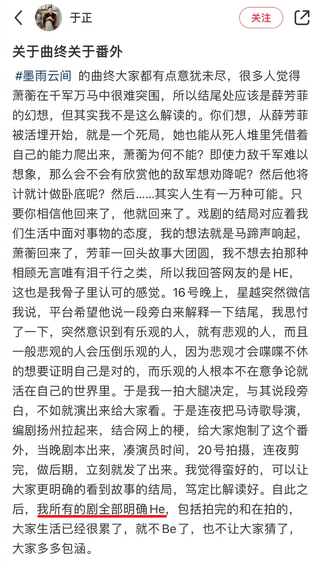 读者和作者的互动在网文创作过程中很常见,在《墨雨云间》播放期间,观众的爽点也体现在和剧方的互动中。已经拍好的电视剧大结局是开放性悲剧,随着话题度和播放量节节攀升,观众对喜剧收尾的呼声愈盛,于正赶在大结局播出前召集原班人马,拍了一段几分钟的“番外”,讲述男女主角团圆美满的婚后生活,以弥补结局里男主身陷沙场、女主枯坐青灯的悲情色彩。在微博和小红书平台上,于正向网友强调,他现在和以后的作品一定都是“HE”(happy ending)。
