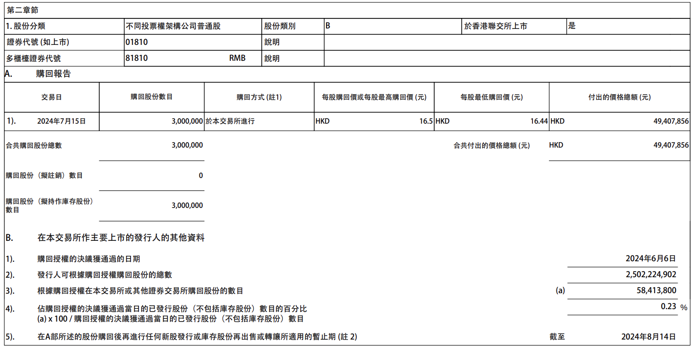 小米集团7月15日在港交所公告,当日以4940.79万港元回购300万股B类股,每股回购价格16.44港元-16.5港元。