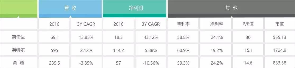 英伟达过去三年营收复合增长率为13.85%,2017财年营收增长率甚至高达38%;毛利率在2017财年Q4已经达到60%,与其他两家公司相当,净利率也与高通持平,因此目前30倍P/E值处在合理区间。