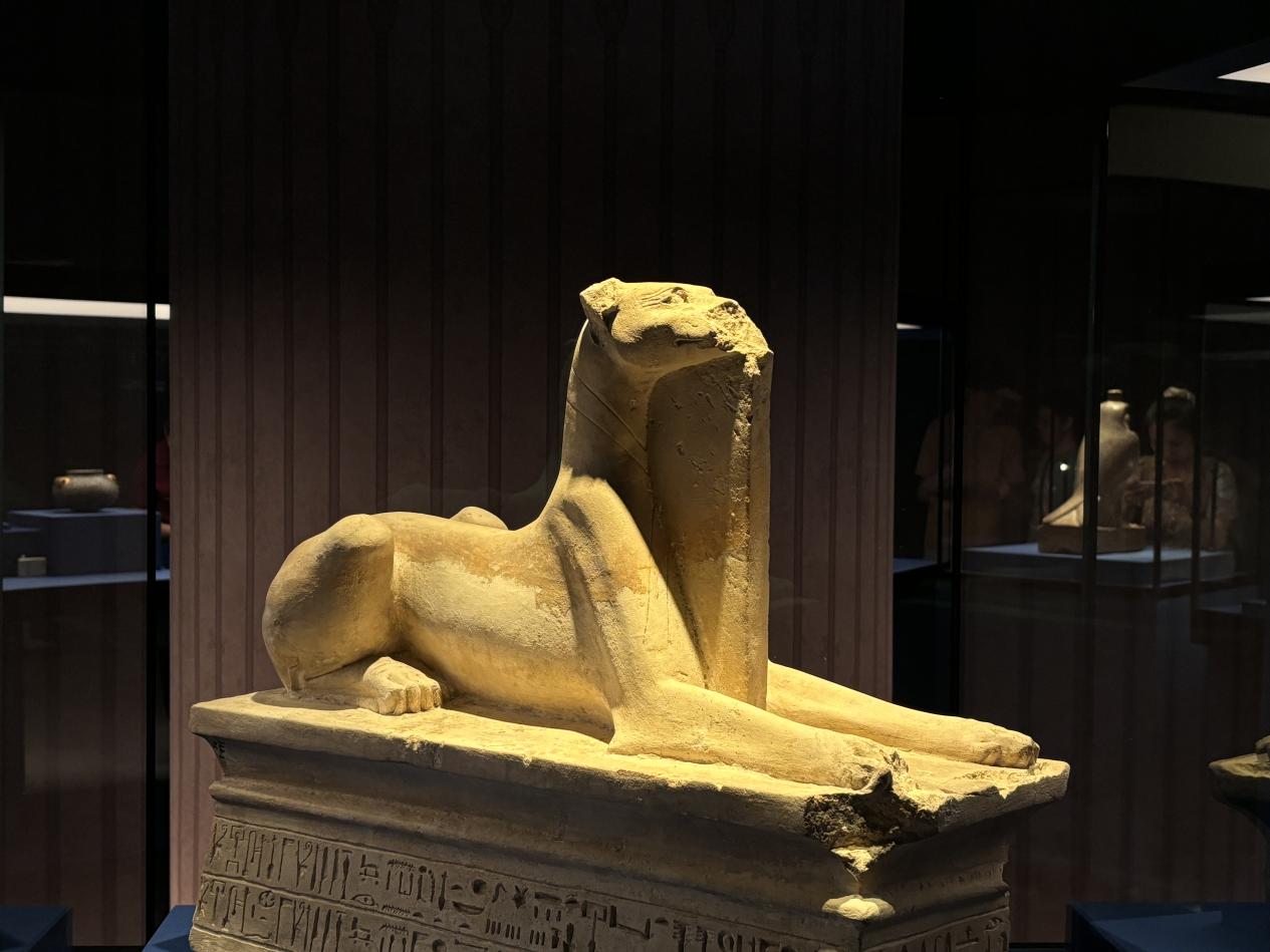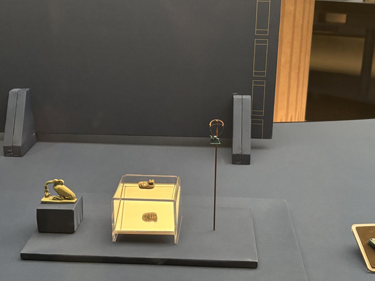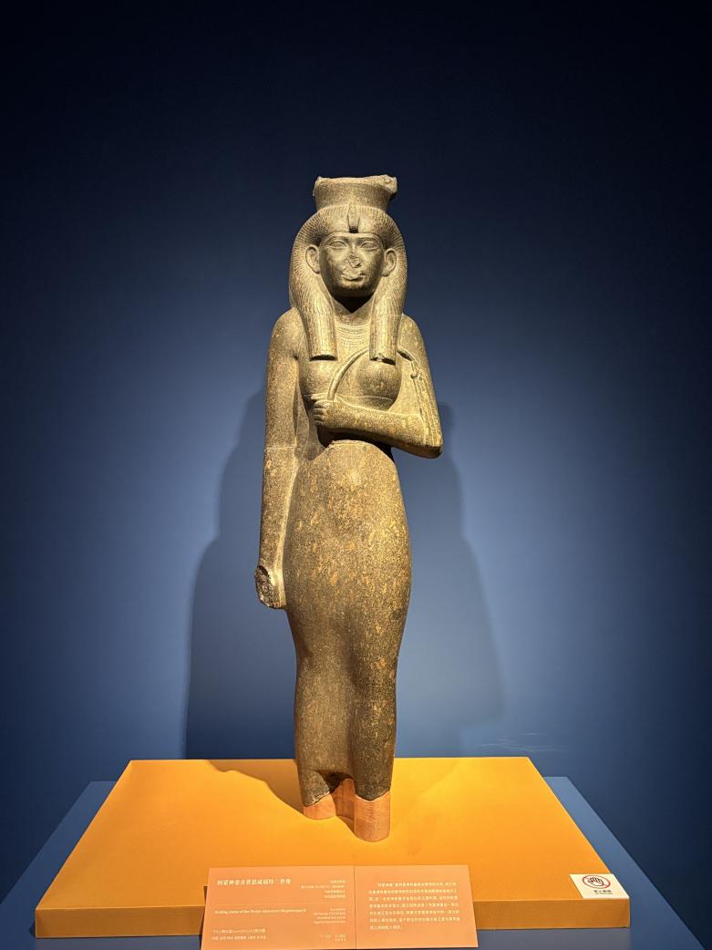步入展厅,穿过古埃及与古代中国的历史对照表,“故事从圆形展台就开始了,首先是古埃及人的宇宙观,”颜海英介绍说,在这一部分,观众将看到装饰陶器、神像雕塑和古埃及饰品等系列文物,一窥古埃及神权与王权信仰的诞生和森严的等级制度。