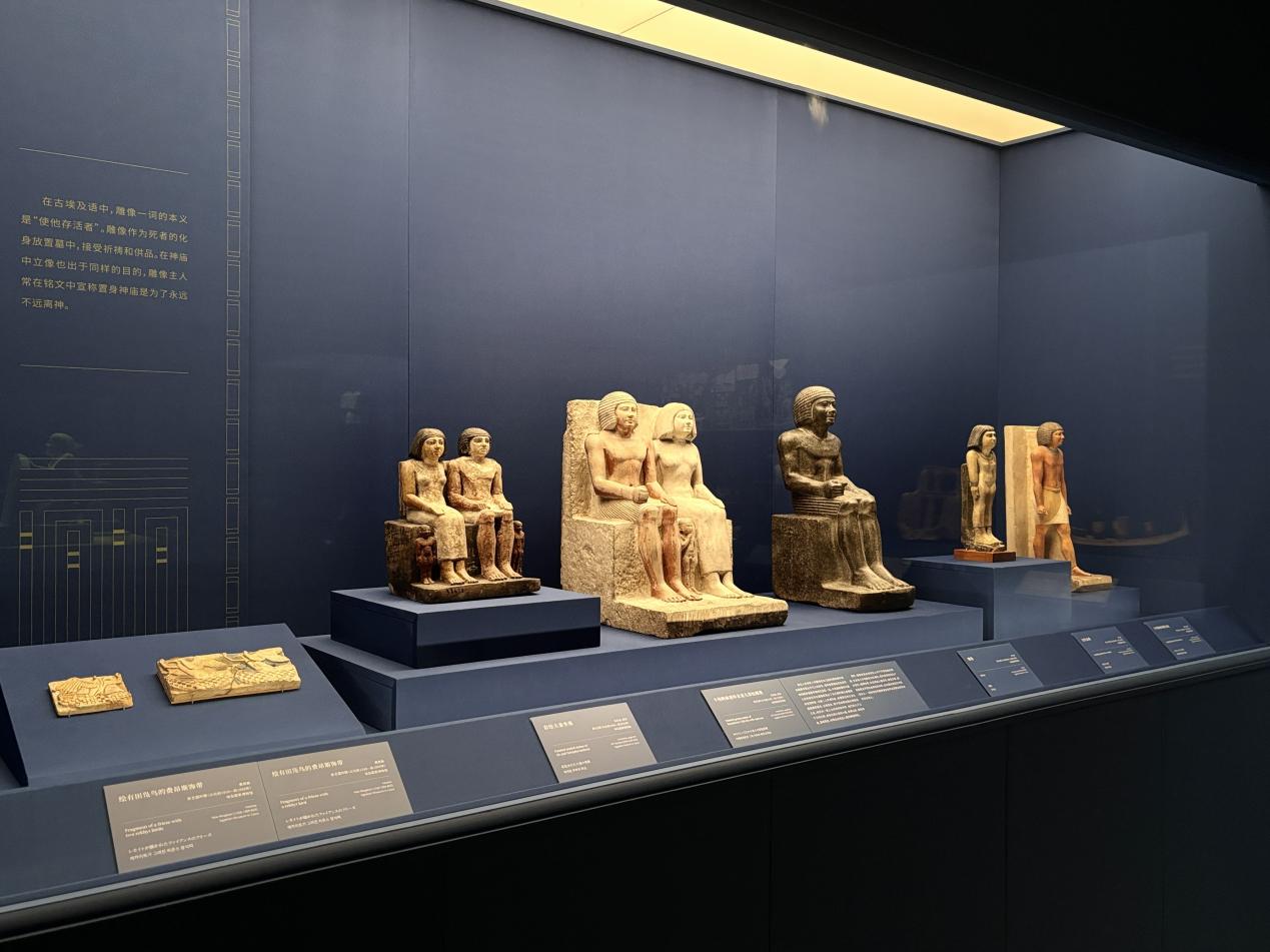 古埃及文明的重要特点之一是信仰来世与永生,墓葬文化也成为本次展览中的重要环节。本次展览的古埃及贵族雕像不仅是精英阶层身份的象征,且多用于死后的供奉仪式,上面通常刻有人名、头衔和祈祷文,确保墓主在现世和来世都获得“永生”。