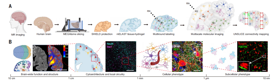 平台的工作流程包括切片、处理、标记、成像和计算拼接人类大脑组织。在磁共振(MR)成像之后,使用MEGAtome将人脑半球切成毫米厚的块。这些块经过处理并转化为mELAST组织水凝胶。坚韧、弹性且可调节大小的mELAST组织水凝胶,经过多轮标记和多尺度成像,以提取高维特征。从切割的人脑组织获得的图像使用UNSLICE管道进行计算性重整,以实现多级连接映射。