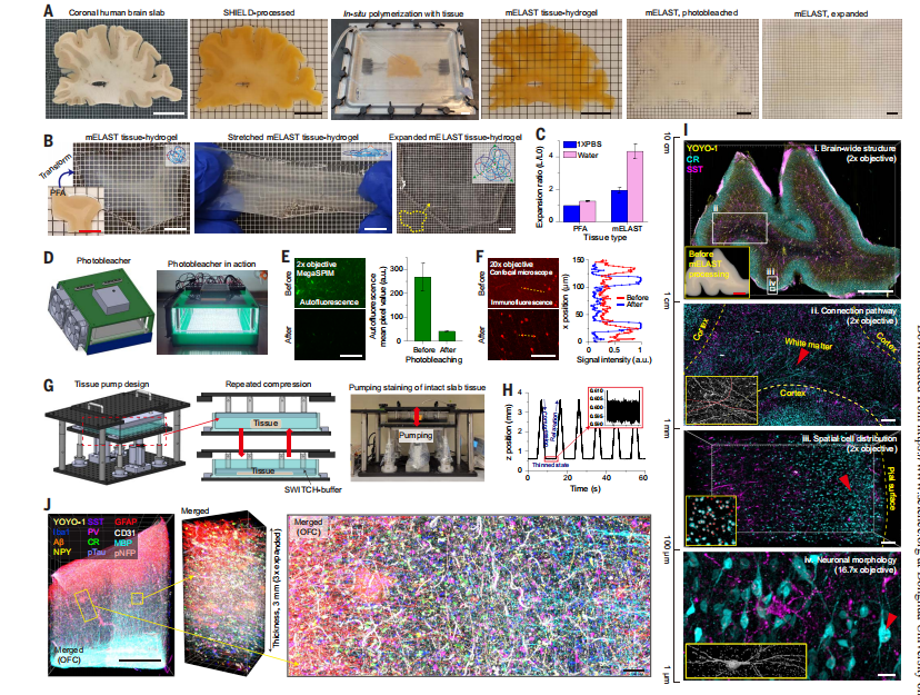 这种水凝胶是弹性的、热化学稳定的,并且能够可逆地扩展。mELAST处理后的组织水凝胶能够在水或磷酸盐缓冲液(PBS)中实现线性扩展,论文中提到实现了4.5倍的线性扩展,同时保持组织的弹性、完整性和耐久性。
