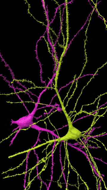 他们重建了数千个神经元,超过一亿个突触连接,以及构成人类大脑物质的所有其他组织元素,包括胶质细胞、血管和髓磷脂。同时,他们还使用机器学习模型对突触位置进行自动识别,以及区分兴奋性、抑制性突触。