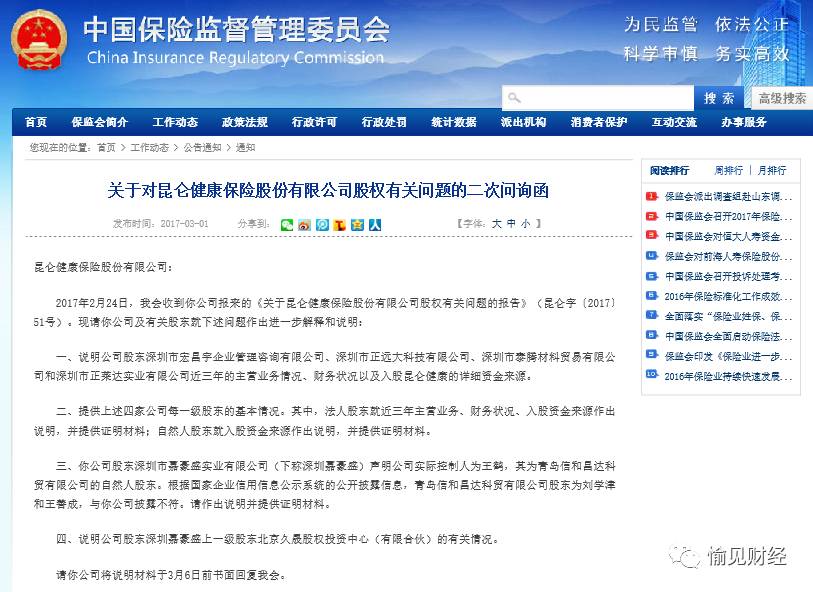 保监会的首例保险机构问询函终于有了新的说法。3月1日中午,保监会官方网站公布称,已于2月24日收到昆仑健康险公司关于股权问题的报告。昆仑健康的回复函中就保监会问询的昆仑健康四家股东是否与“佳兆业郭英成家族”有关、入股资金是否来源于“佳兆业郭英成家族”下属企业或其关联方等问题均予以否认,并表示昆仑健康并无实际控制人。但是因有部分问题待解,保监会在该回复函的基础上,二次问询昆仑健康。