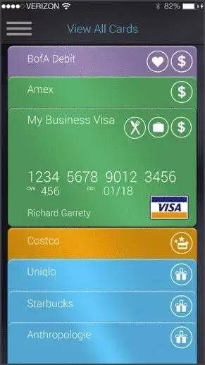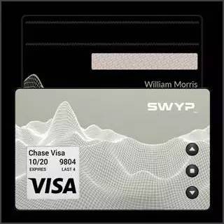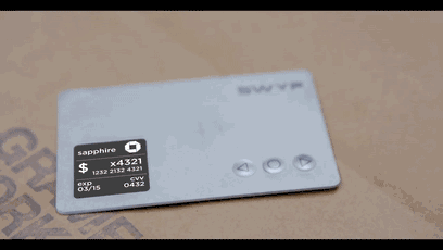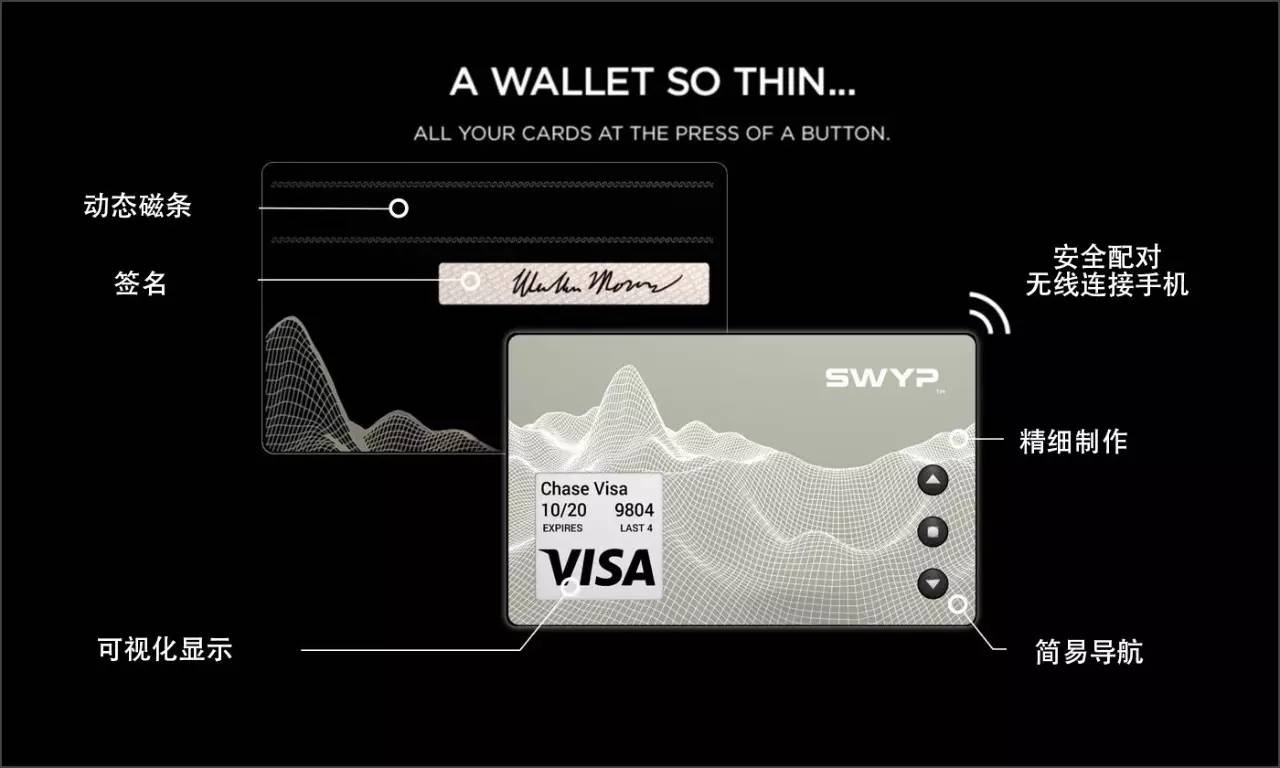 SWYP 最多可存储 25 张磁条卡的信息,卡上有按钮可进行选择,同时显示屏会显示相应卡的卡名、卡号、图案、有效日期等。