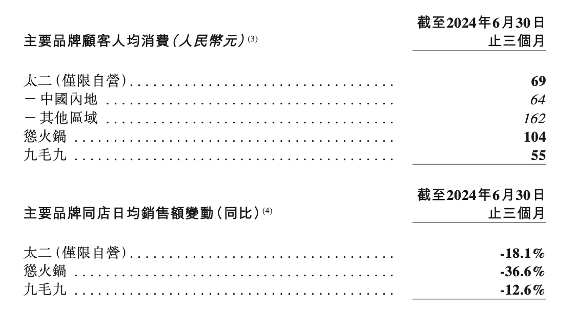 九毛九在公告中表示,第二季度太二(中国内地餐厅)及怂火锅的顾客人均消费下降由于外部环境变化,品牌调整发展策略从而持续调整菜单结构、增加推广活动所致。此外,位于低线城市的太二餐厅比例提升也导致太二在中国内地的顾客人均消费下降。