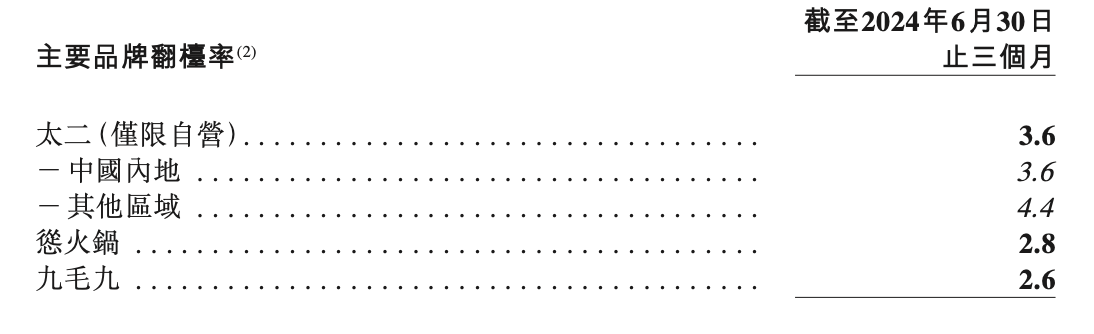 根据九毛九第二季度运营表现公告,截至6月30日止三个月,九毛九主力品牌太二(自营门店)、怂火锅、九毛九的翻台率分别为3.6、2.8、2.6;2023年上半年,这个数字分别为4.3、3.9、2.8,出现明显下滑。
